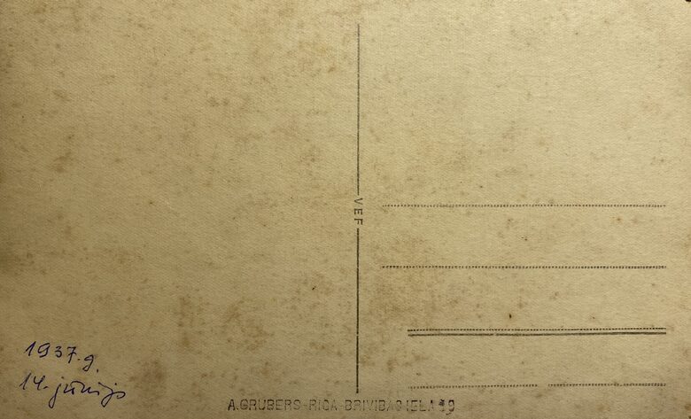 Delikāts zīmuļa uzraksts foto priekšpusē fiksē 1937. gada 14. jūniju. Pieminekļa pakājē redzama godasardze vasaras formas tērpos.